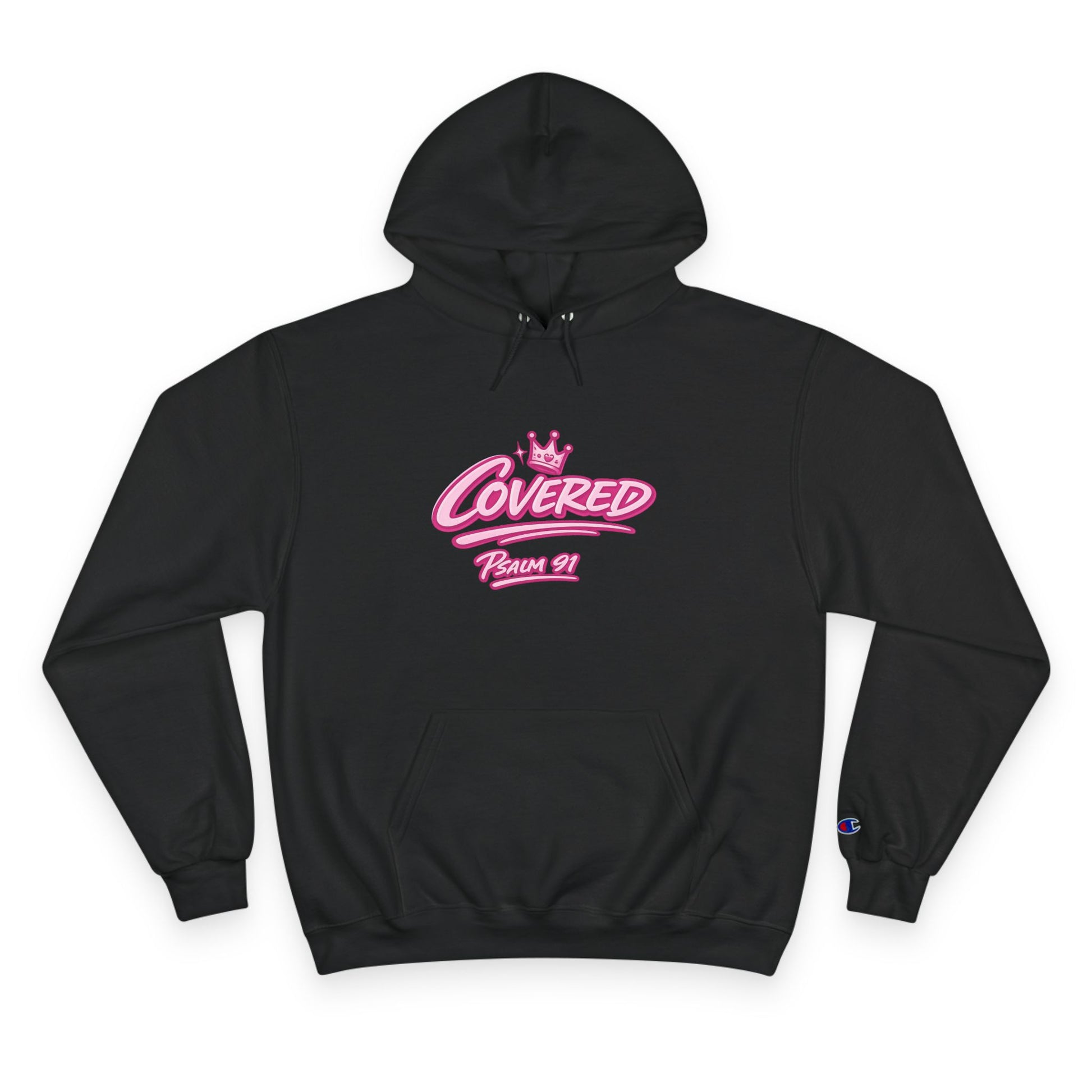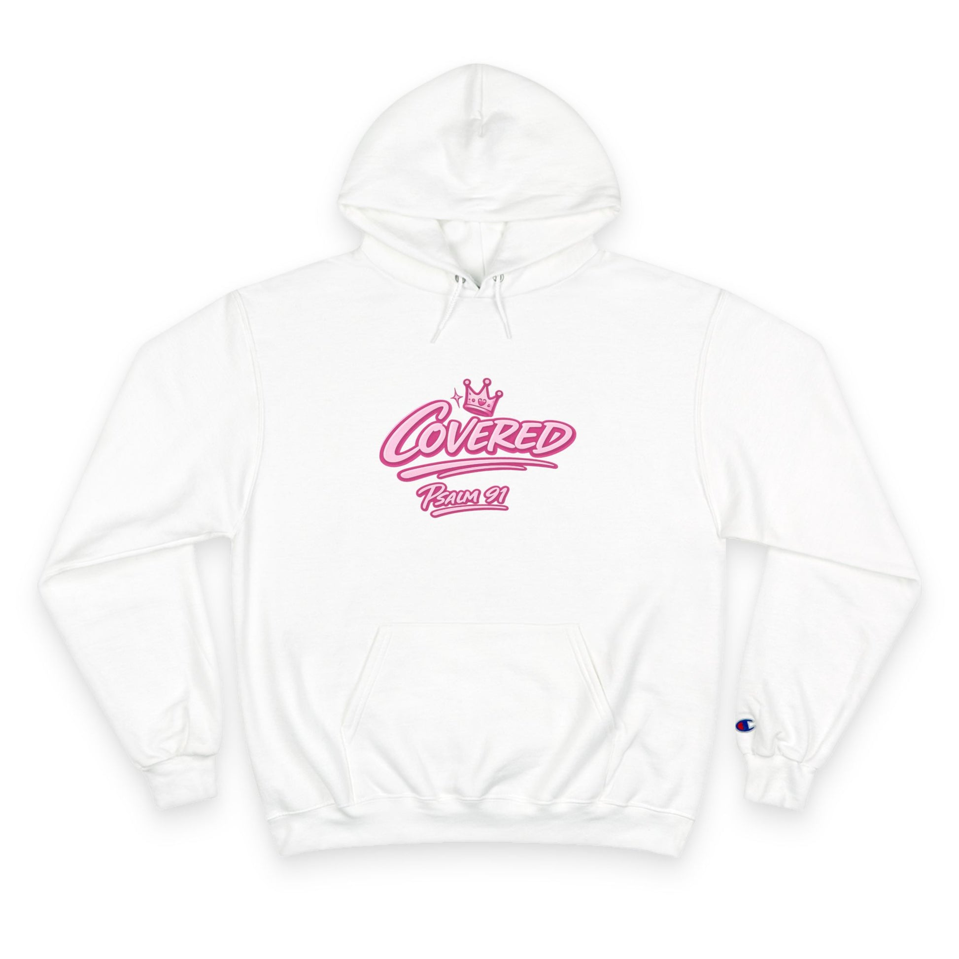 Spiritual armor in a premium streetwear classic. This authentic Champion brand hoodie features our exclusive "Kovered By Grace" design. Created for the praying creative, this piece features bold pink hand-scripted designs on both the front and back, honoring the promises of protection and strength found in the Psalms.